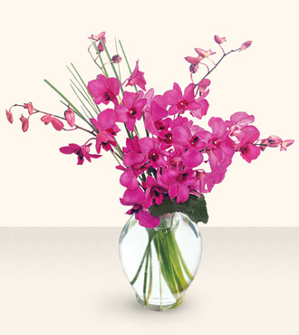 Dendrobium orchids in a rich purple hue are discreetly accented with bear grass. Arranged in a clear urn-shaped vase, this bouquet is perfect for any time, any occasion, or 'just because'.