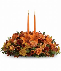 As your loved ones gather around the table, they'll bask in the warm glow of two orange taper candles surrounded by a fantastic array of fall flowers.